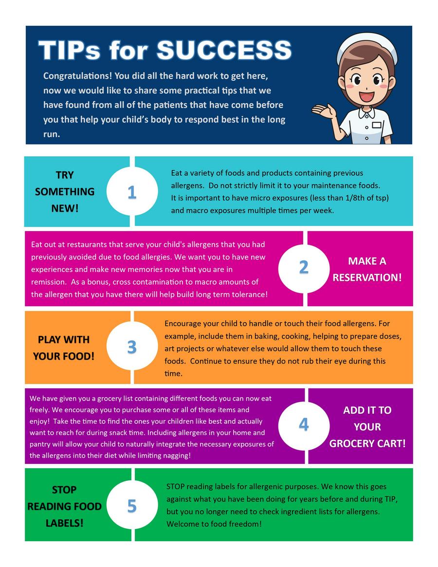 Initially in remission, most maintenance foods are moved to a weekly basis. It is very important that the patient continues to consume their weekly maintenance foods to ensure their body is continuously being exposed to the proteins. Our patients that do best in remission find ways to enjoy maintenance foods beyond just their weekly dose by integrating them into snacks and meals throughout the week. See our TIPs for Success graphic below for other ways to be successful in remission.